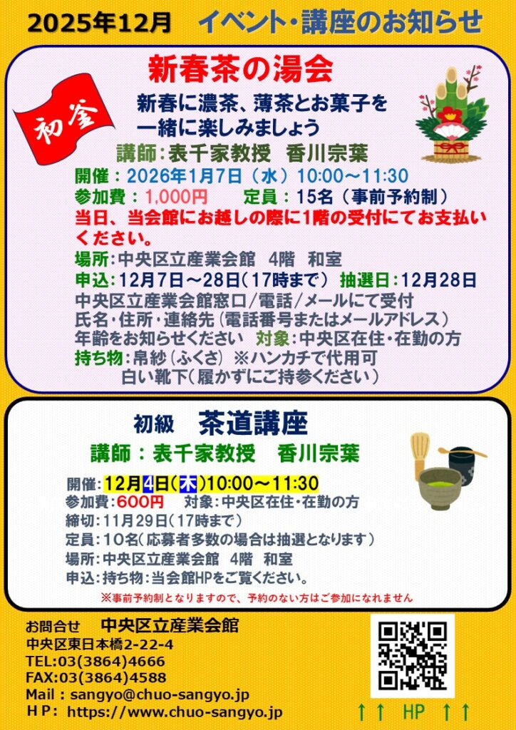 12月4日:600円、1月7日:1,000円  ※当日、当会館にお越しの際に1F受付でお支払いください。